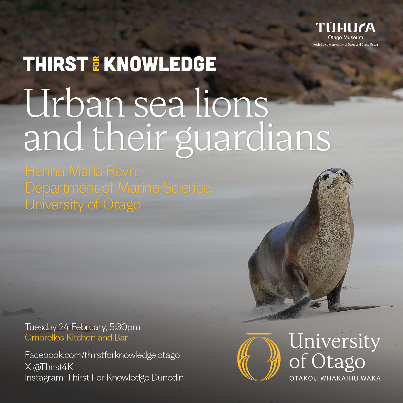 Join us for drinks and discussion as we explore the fascinating lives of New Zealand's urban sea lions and the dedicated people working to protect them.