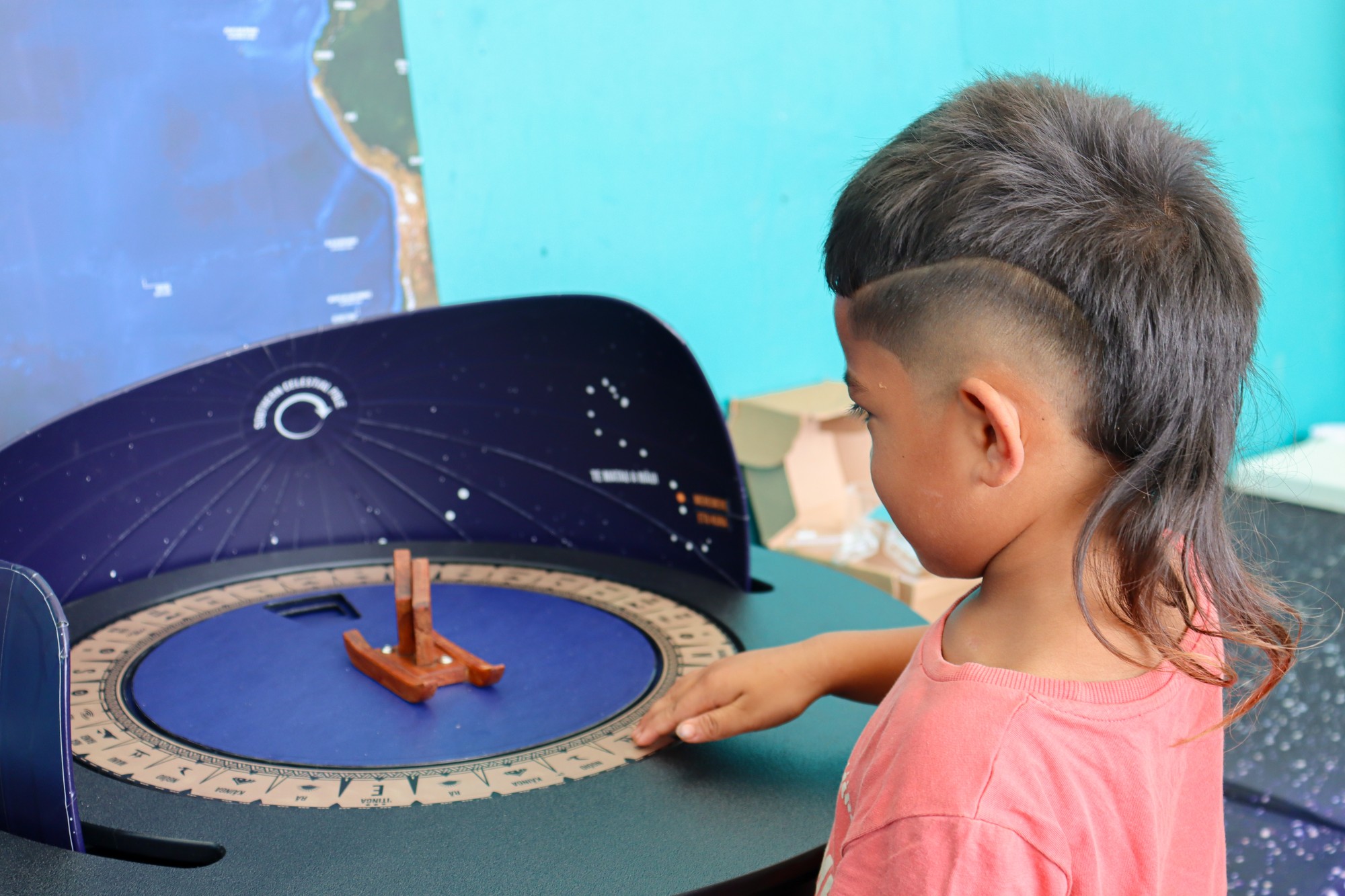 Also donated was a celestial navigation interactive (also pictured above). It showcases how stars rise and set, and how stars can be used with traditional knowledge systems to navigate a waka through the vast Pacific Ocean.