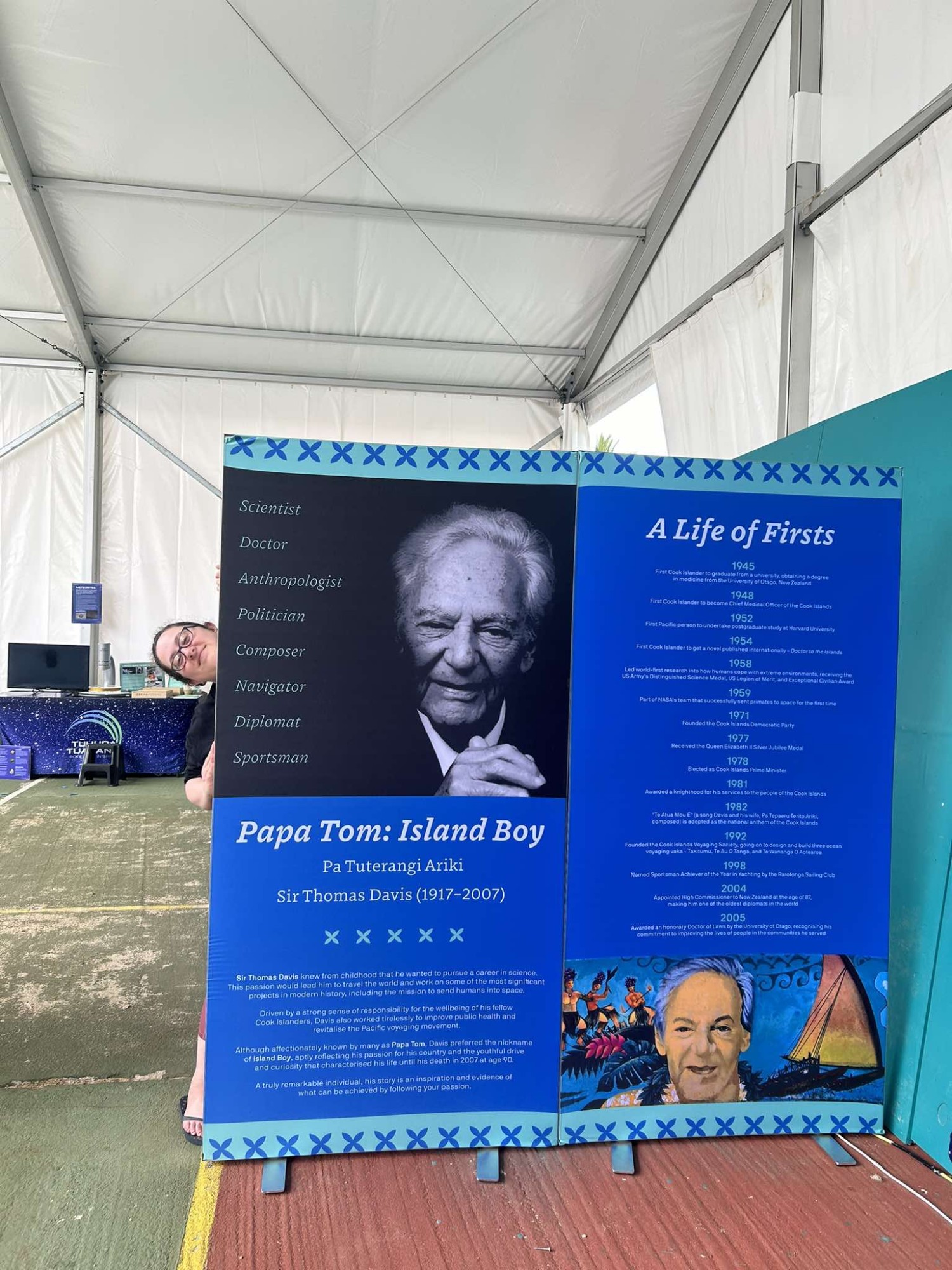 As part of this project, we also created the Papa Tom display. It summarises the life and achievements of Sir Thomas Davis, who was from the Cook Islands. He became a doctor and the chief medical officer for the Cook Islands, was the first Pacific person to attend Harvard for postgraduate studies, and then went on to do medical research for NASA and the US Army. He became the Prime Minister of the Cook Islands and revitalised the Pacific voyaging movement. The Sir Thomas Davis Indigenous Innovation and Inspiration display was donated to Te Ara – Cook Islands Museum and is pictured on display below. This display will be able to continue to inspire community members long into the future.